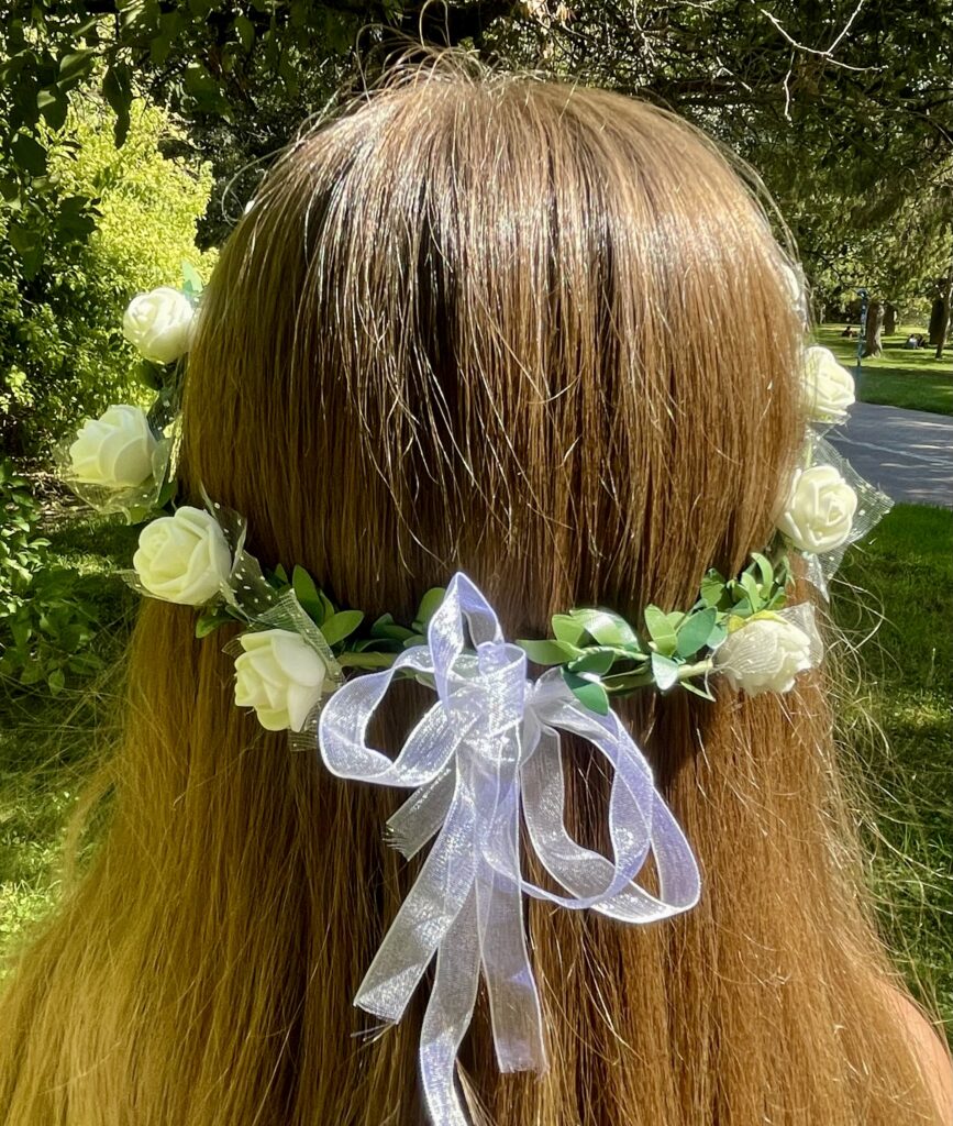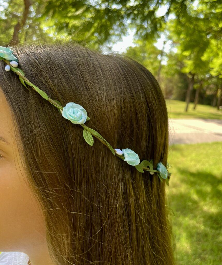 Decorada con pequeñas flores de tela y hojas verdes, esta diadema incluye dos enredaderas que cuelgan desde la parte trasera de la cabeza, dando un toque natural y elegante.