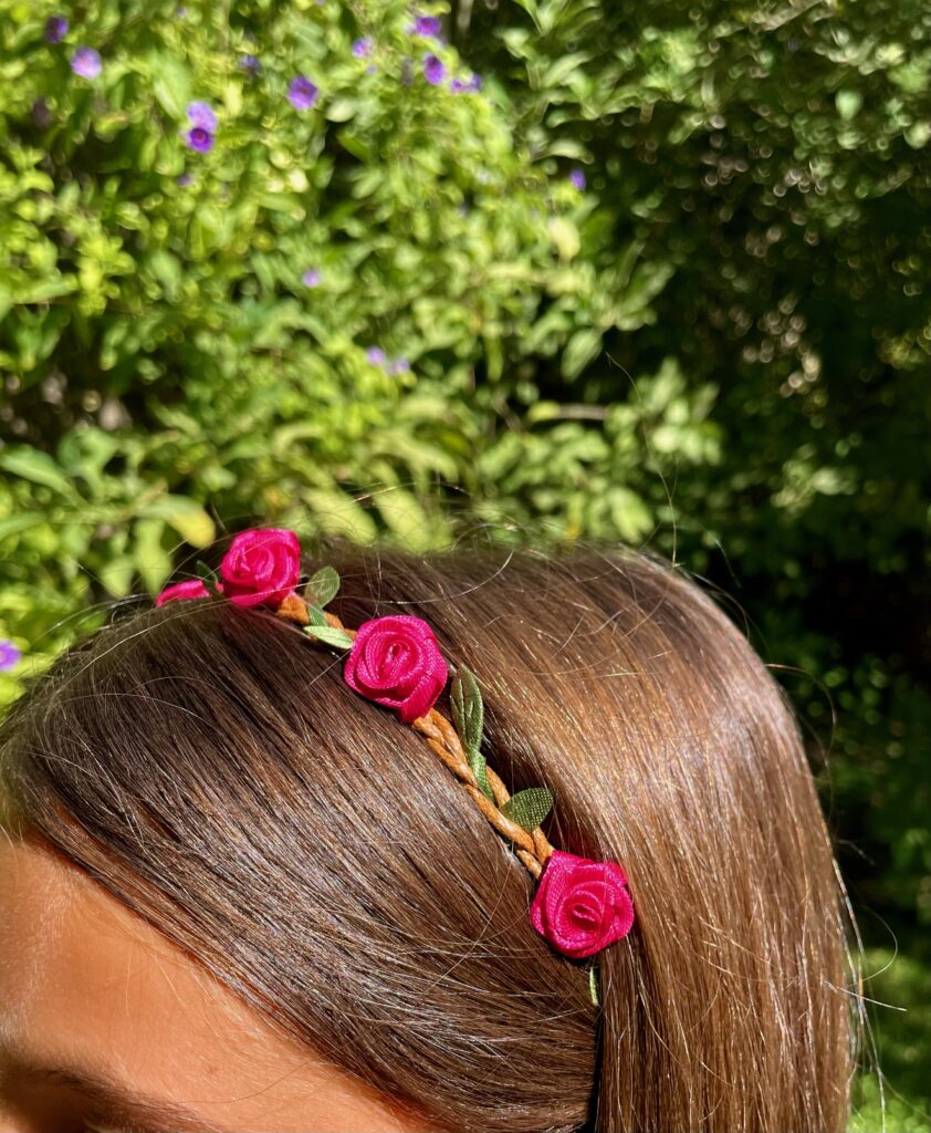 Esta diadema cuenta con pequeñas flores de tela rodeadas por una trenza que recorre todo su alrededor. En la parte inferior, tiene una goma elástica que se ajusta cómodamente, haciéndola ideal para personas de todas las edades.